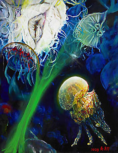 在深遠的背景裏體態輕盈的僧帽水母浮游在眾多的海月水母之中,似乎在沉靜的對話,一道綠光由淺穿向不可知的深處,構成一幅幽靜的世界。